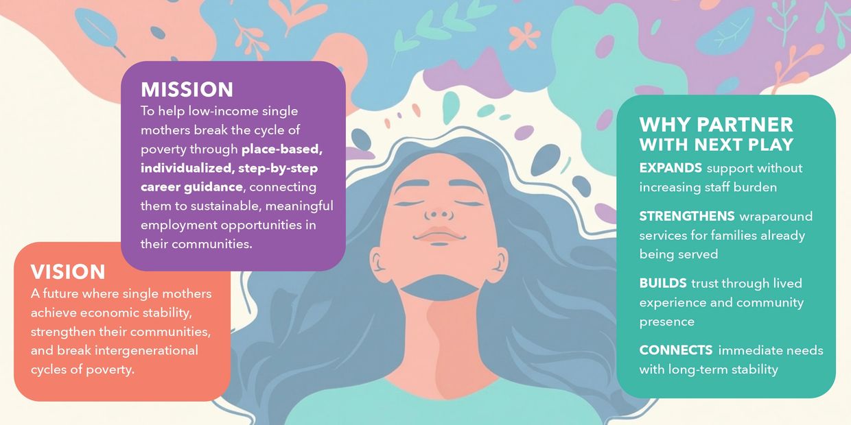 Next Play collaborates with trusted local partners to deliver hands-on, supportive programming for single mothers navigating economic and life transitions.